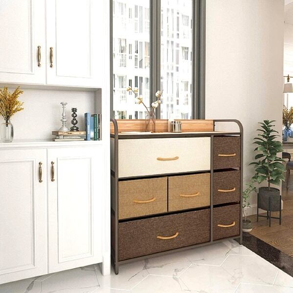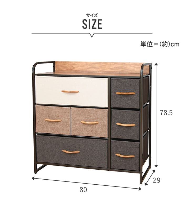 木目と布地がおしゃれでシンプルな布張りカラーチェスト、3段7杯ワイドタイプです。