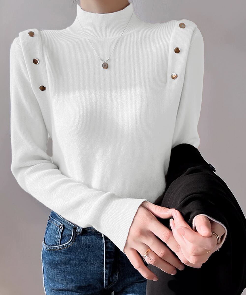 肩部分にゴールドのボタンデザインが施されたキレイめなニットトップス