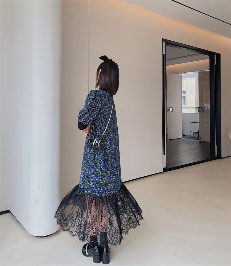 レディースワンピース シフトドレス ワンピ 小花柄 チュニック 花柄レース ドッキング