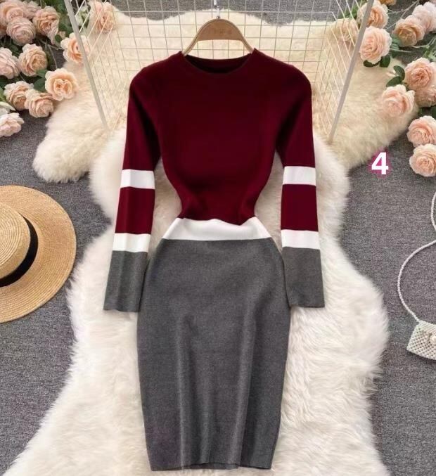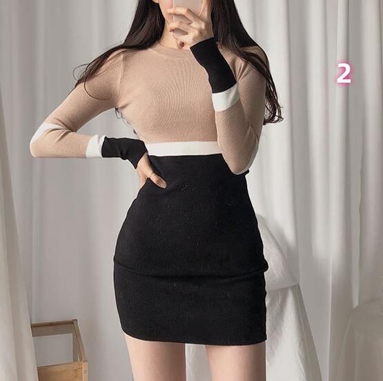 レディース ハイウエスト 長袖 ニット ミニ ワンピース ドレス タイトスカート