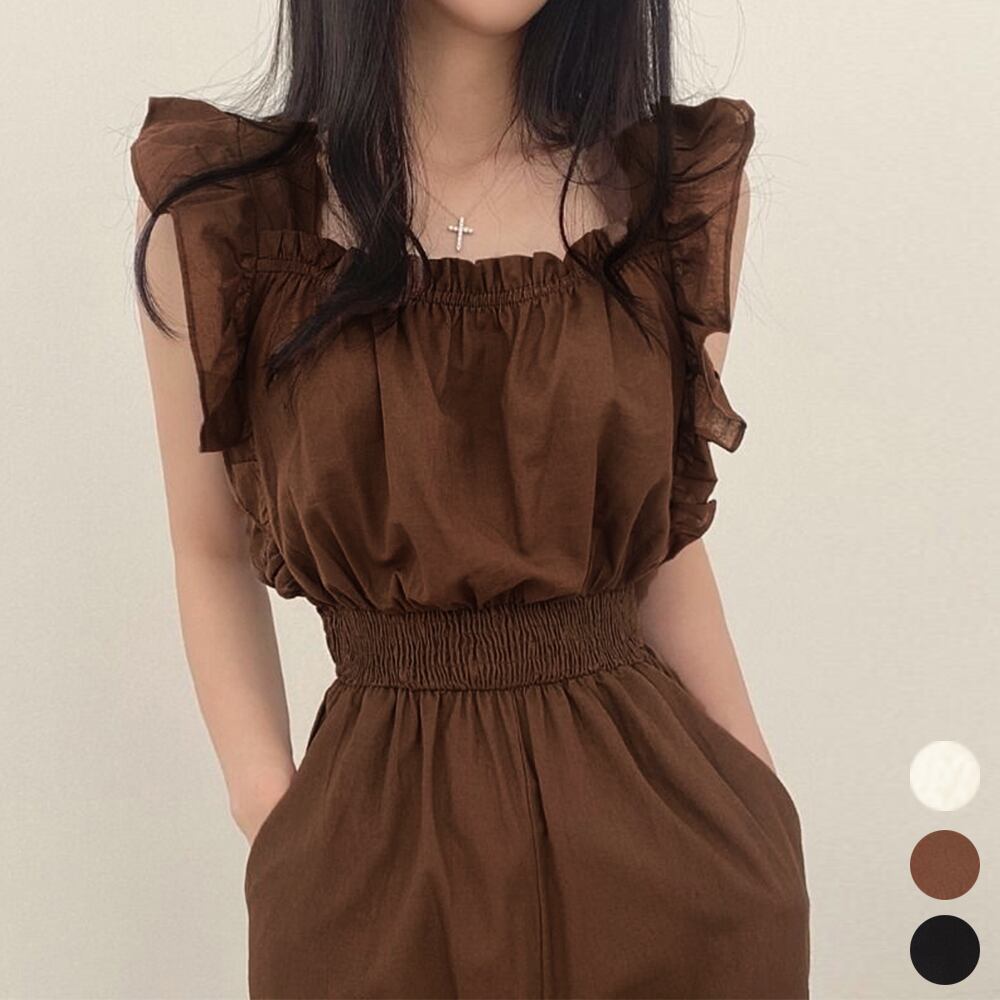 レディース 可愛い ロンパース スクエアネック ハイウエスト ジャンプスーツ ノースリーブ レトロ無地 コンビネゾン韓国
