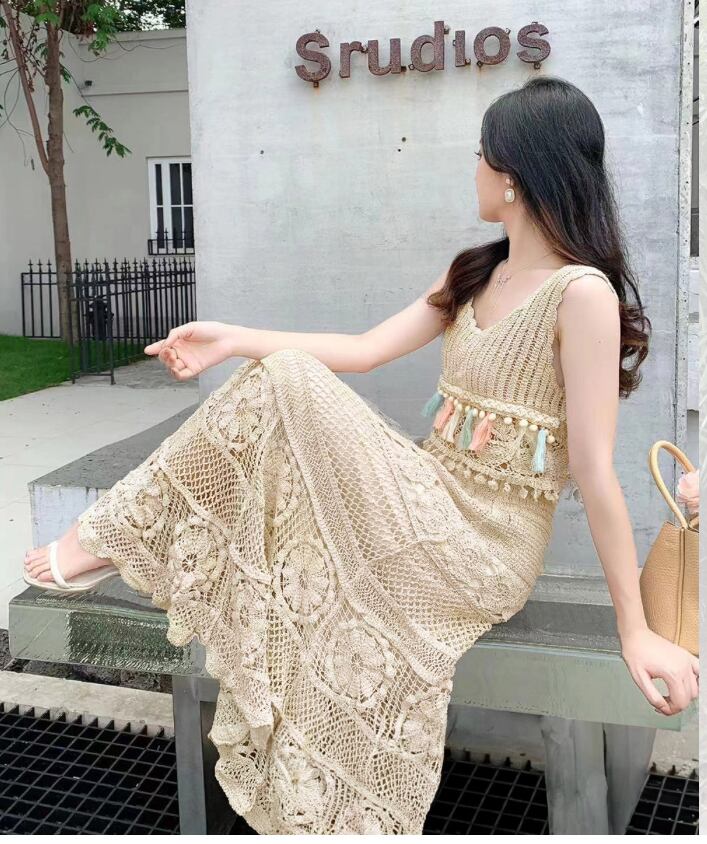 透かし編みビスチェ ロングスカート レディース サマーニット2点セットフリンジタンクトップ フレアスカート ビーチウェア