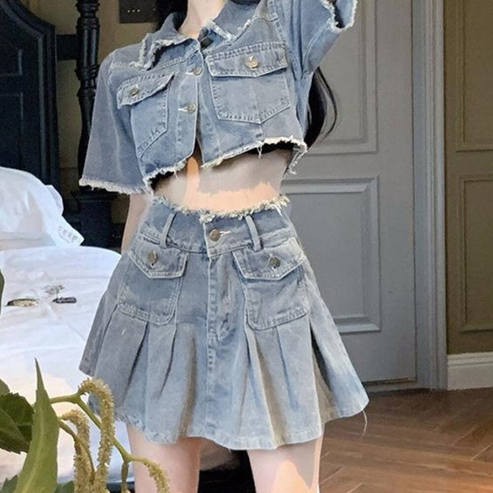 半袖 クラッシュデニムジャケット 薄手 ダメージデニム ミニスカート カジュアル 上下セット おしゃれ アンサンブル夏服