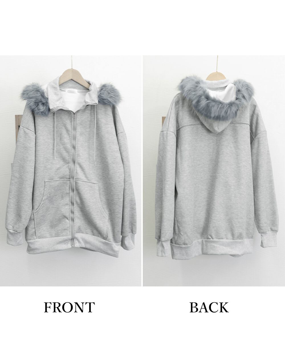 ふわふわのファーフード付きで、大人カジュアルにぴったりの裏微起毛ジップアップパーカー