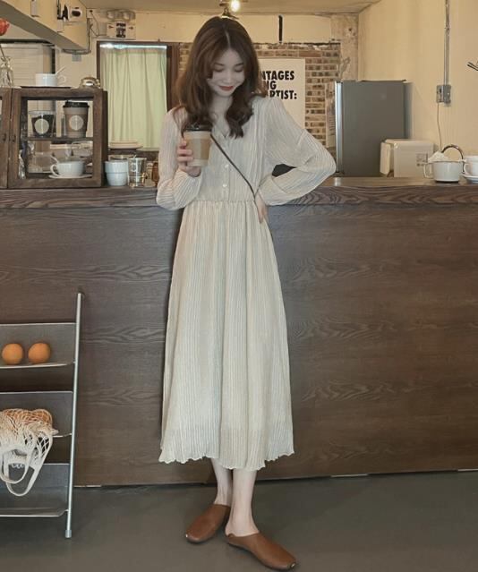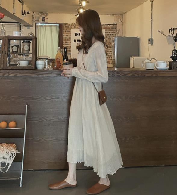 2024春秋新作 女 レディースハイウエスト 長袖 シフォン ロング ワンピース 台型スカート