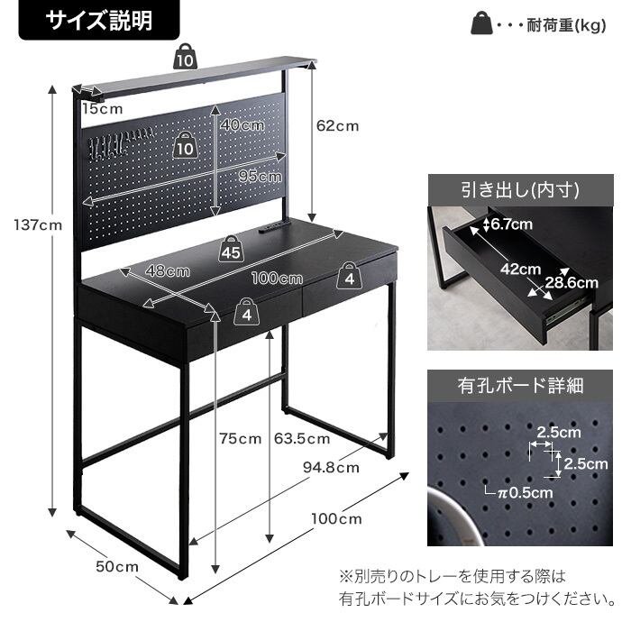【耐荷重】天板ラック:約10kg 、有孔ボード:約10kg、天板:約45kg、各引き出し:約5kg