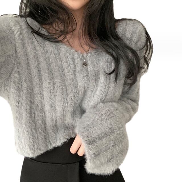 秋冬新作 モヘア調 ミニ丈 ショート丈 Vネック トップス プルオーバー ニット セーター