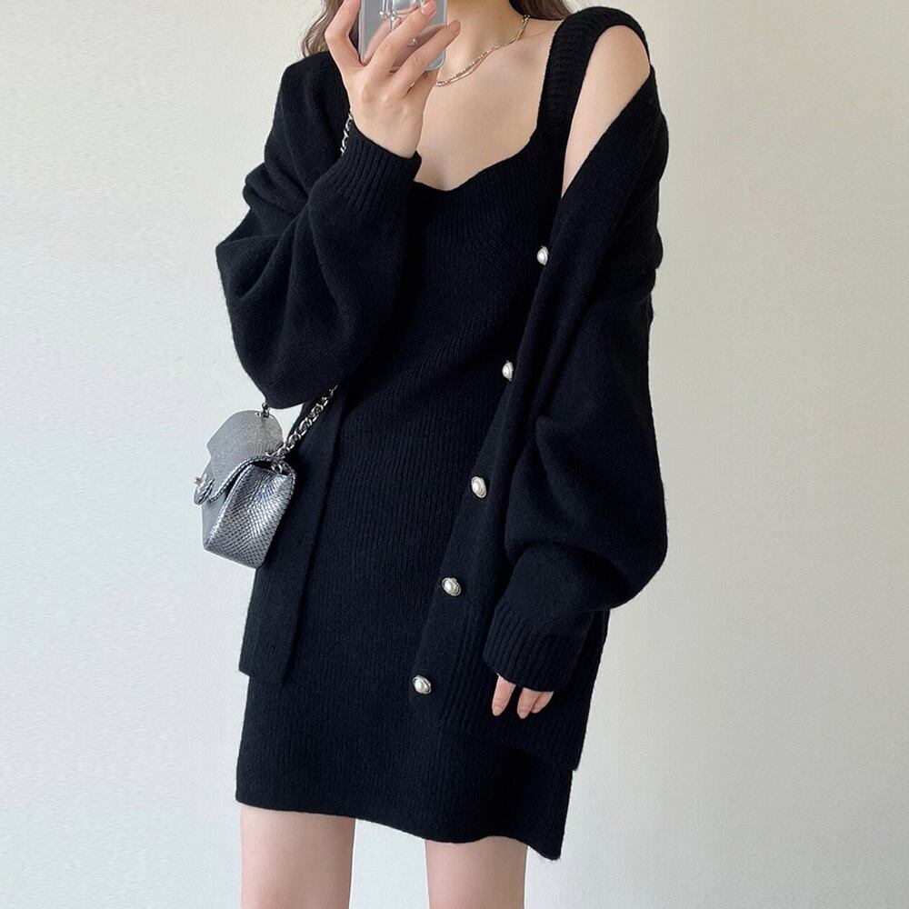フェミニンなスクエアネックデザインのミニワンピースと、着心地抜群の長袖カーディガンがセットになっています