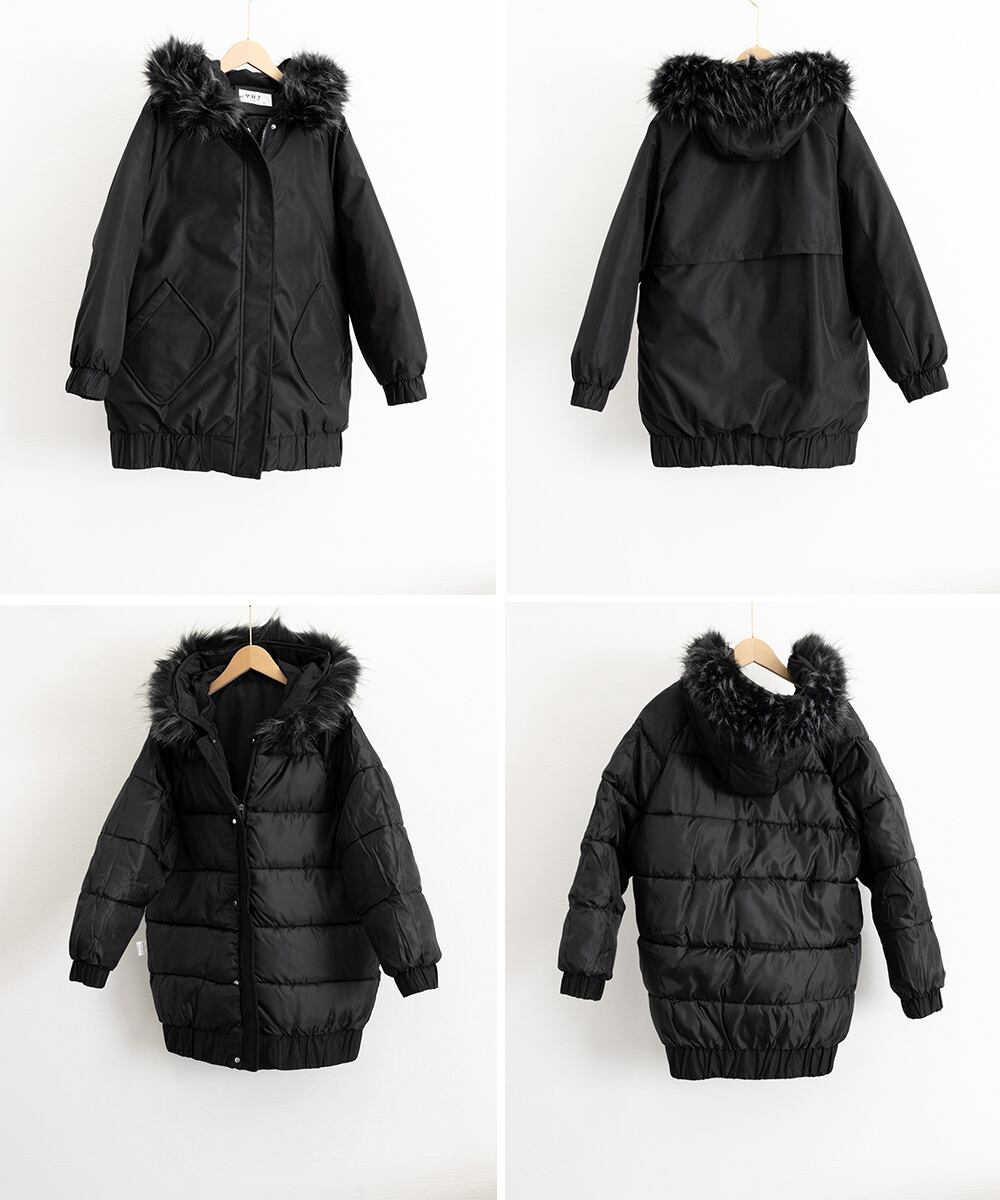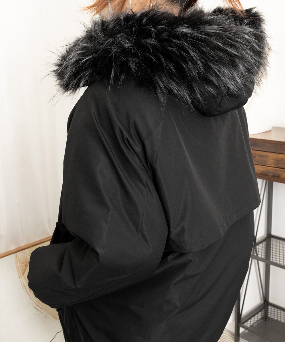 フードについているエコファーは取り外し可能なので、ゴージャスにもスッキリにも簡単にアレンジ可能