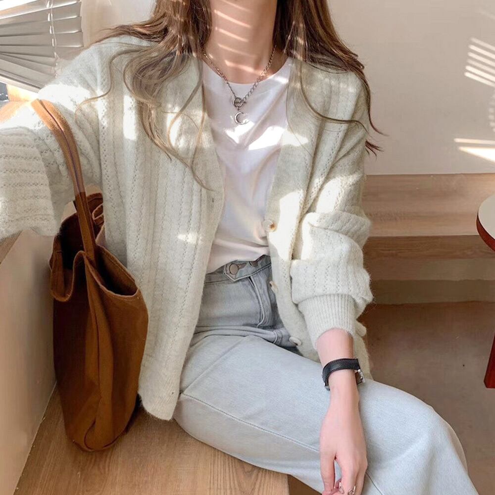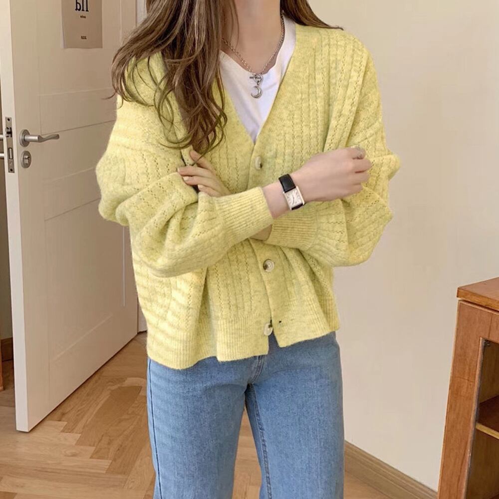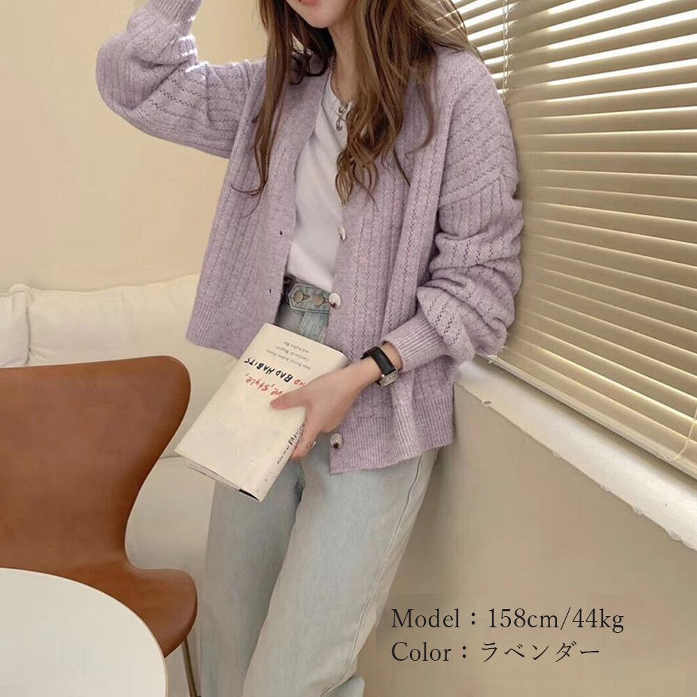 ドロップショルダー ニットカーディガン 秋冬新作 リブ編み ニットトップス 長袖 ゆったり ショート丈 羽織 vネック