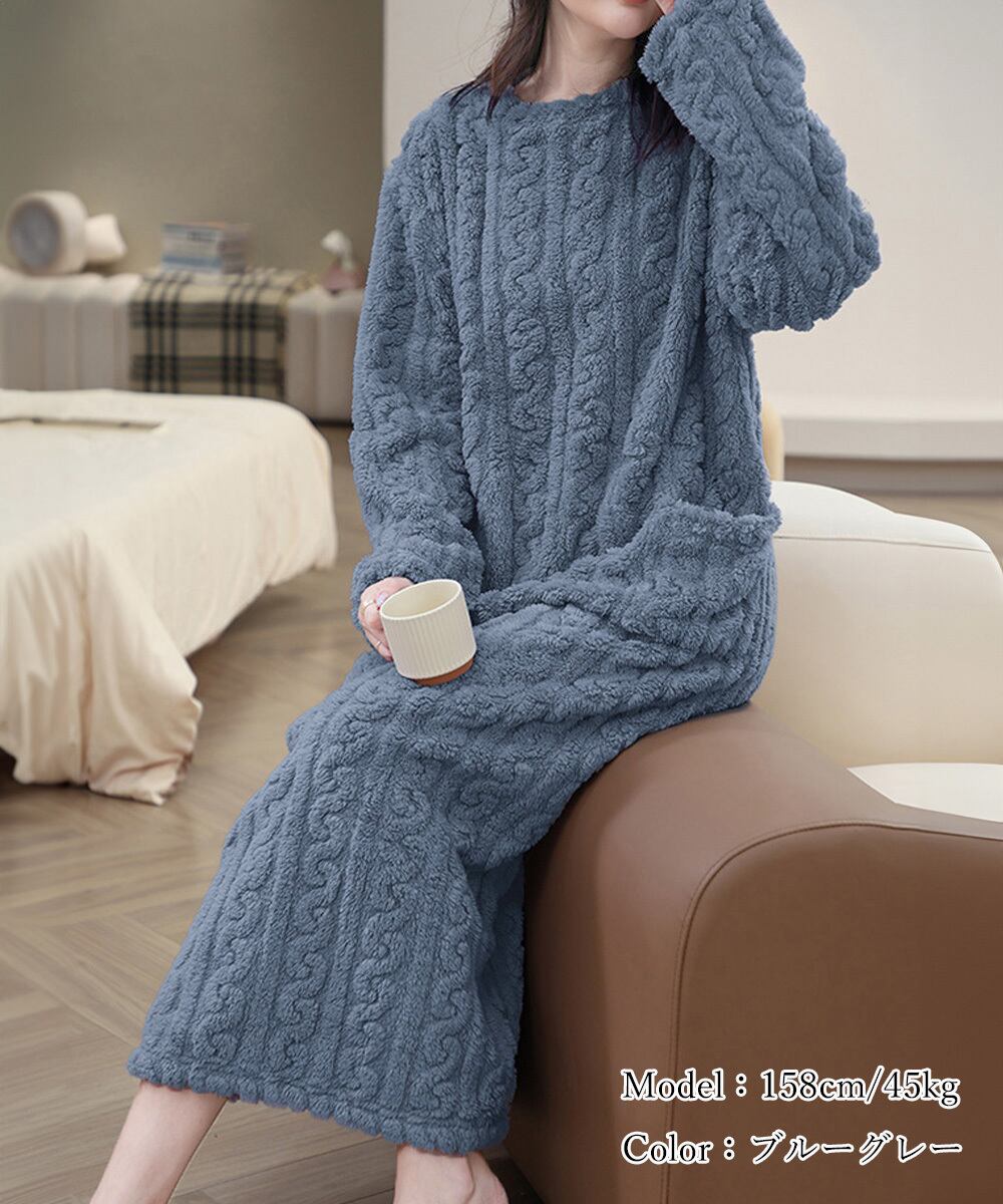 ケーブル柄ルームウェア もこもこ ナイトウェア ふわふわ 軽く暖かい 厚手部屋着 無地あったか寝間着 保温保暖 6色展開