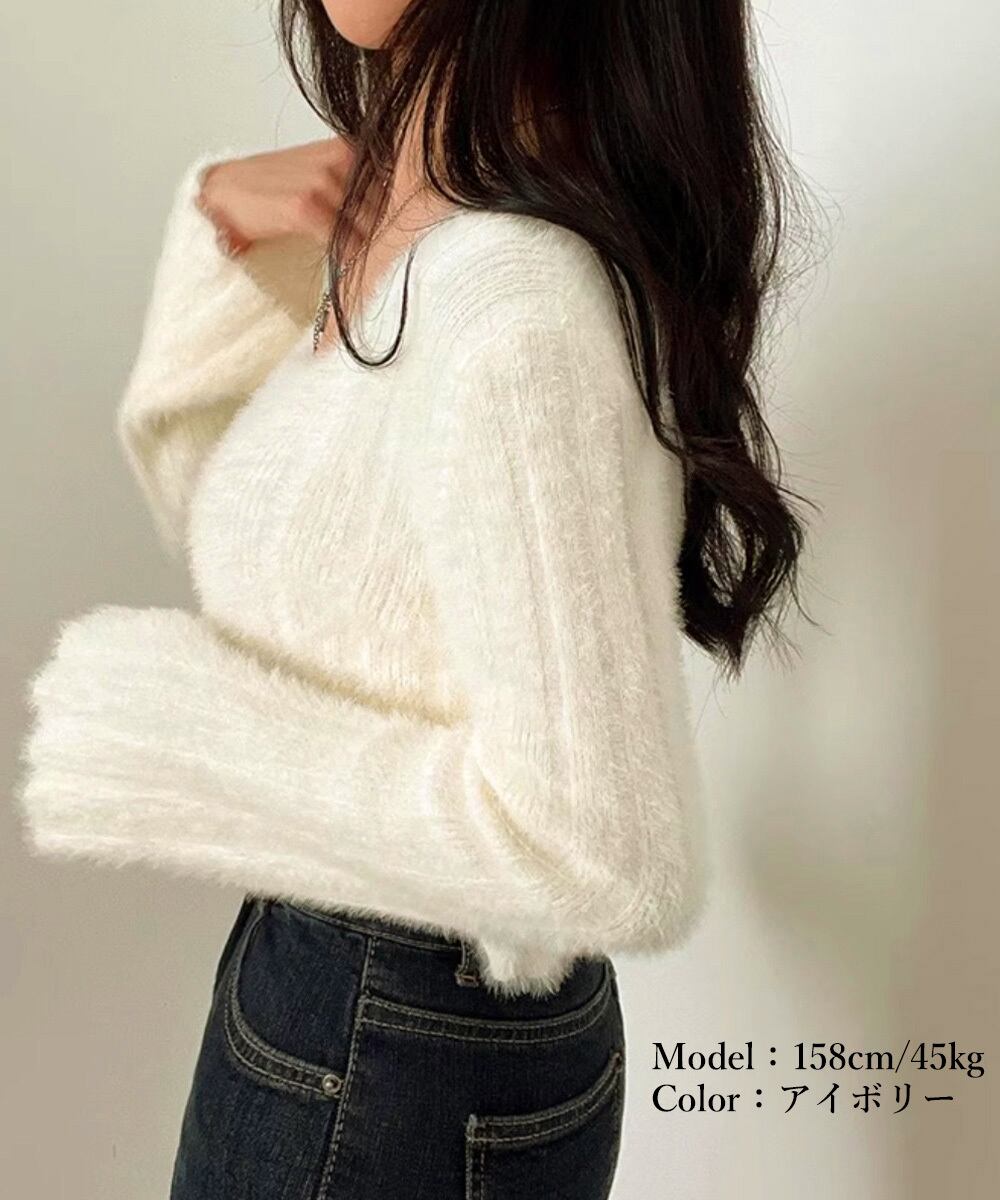 きれいめニット長袖 ショート丈トップス モヘア調ニット起毛