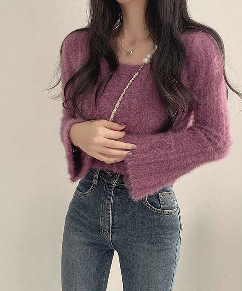レディース ふわふわニットプルオーバー フレア袖 ニットセーター スクエアネック 大人可愛い 無地 柔らかいニット 秋冬