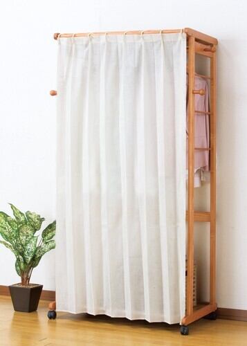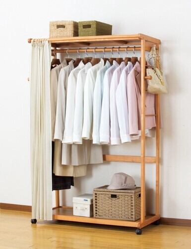 ワンピースなど丈の長い物も掛けられる天然木のカーテン付きハンガー。