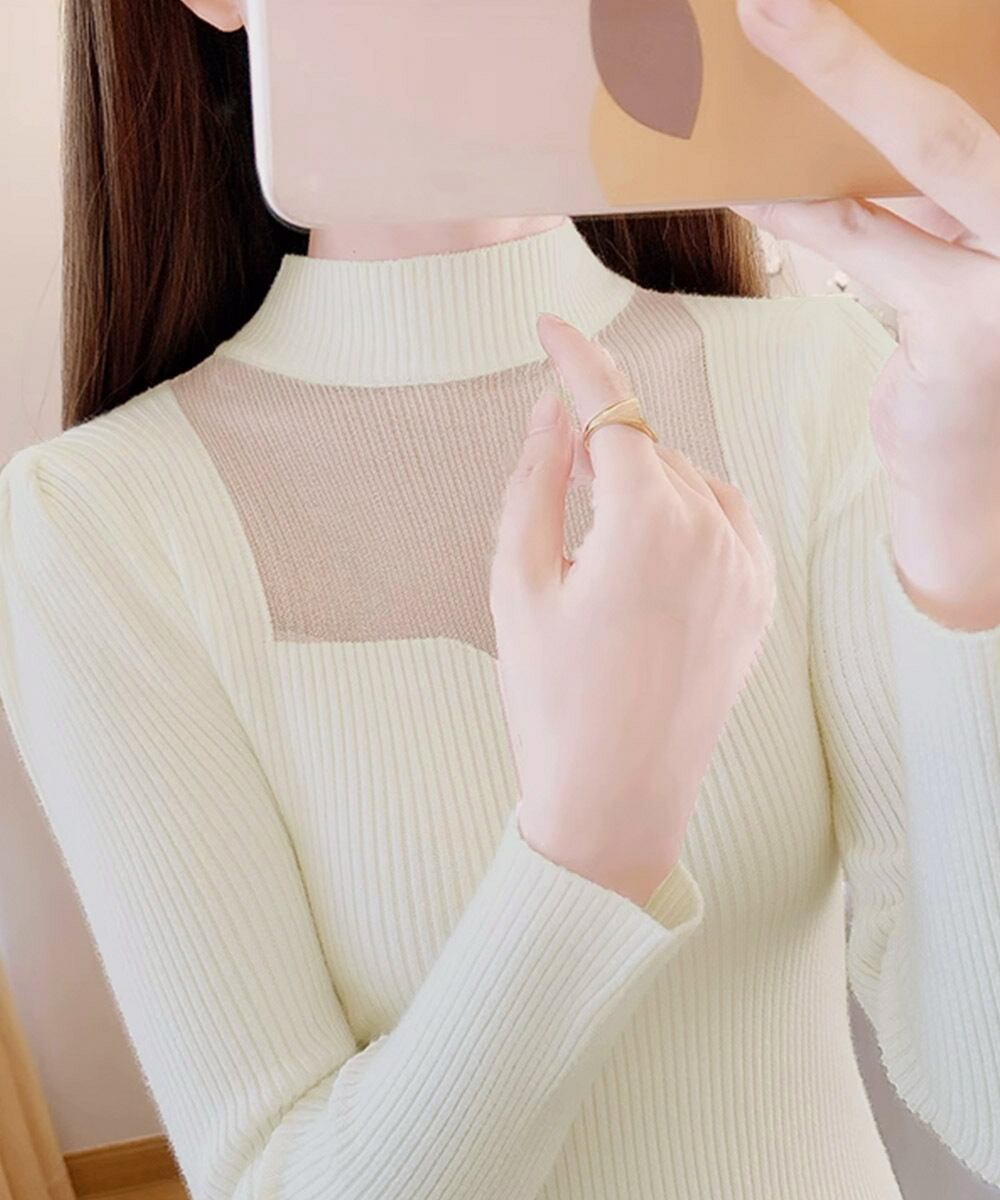 胸元シースルー リブニットプルオーバー 肌見せ 春秋冬ニットウェア 着回し きれいめ オルチャンニットインナー セクシー