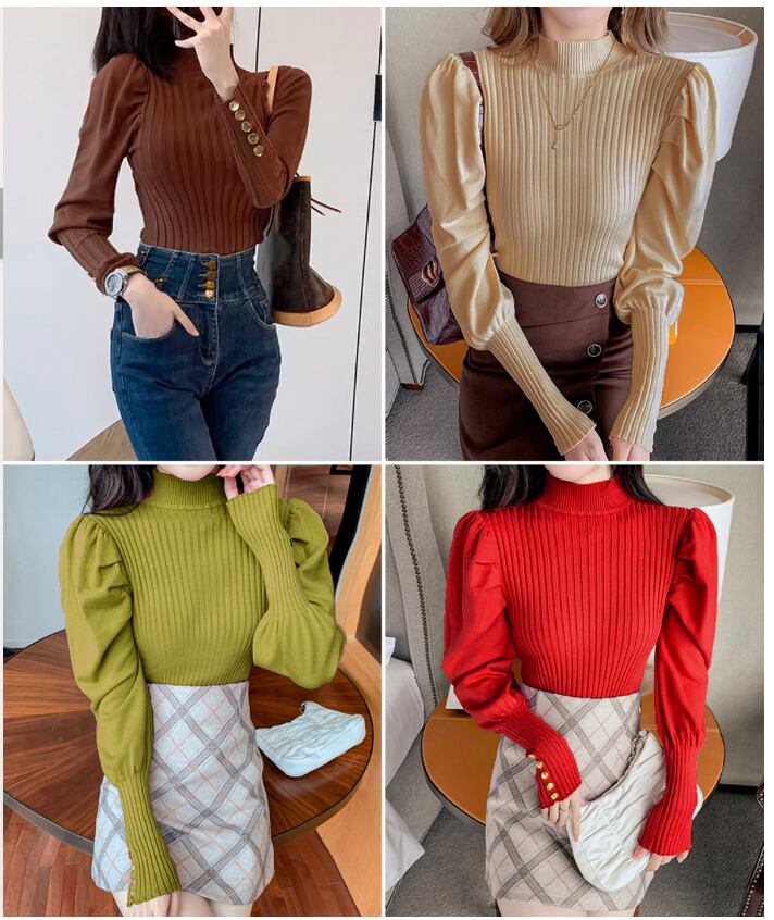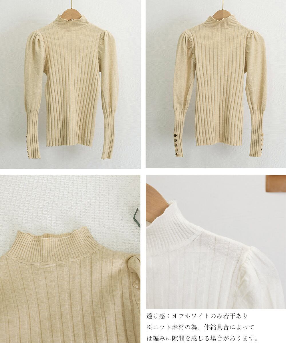 レディース パフスリーブ ニットプルオーバー プチハイネック きれいめリブニット 長袖無地 シンプルニットソーおしゃれ