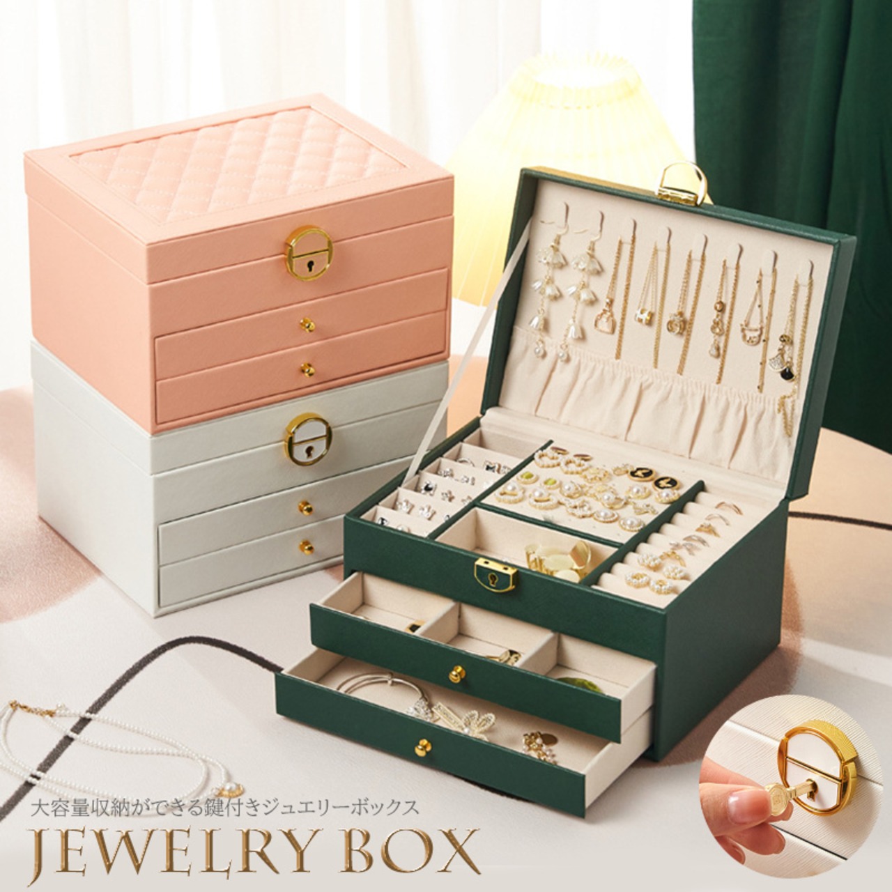 大容量収納ができる鍵付きジュエリーボックス