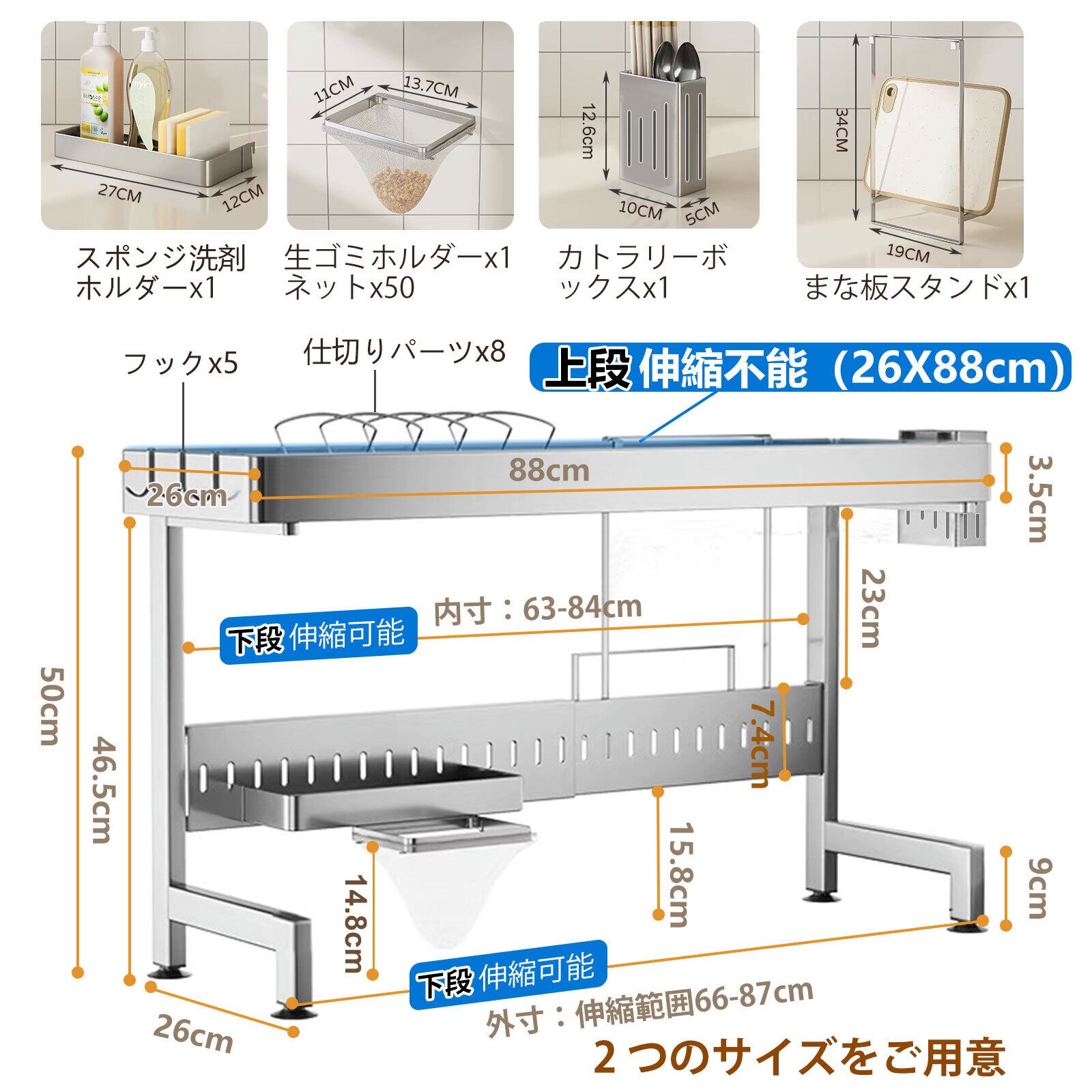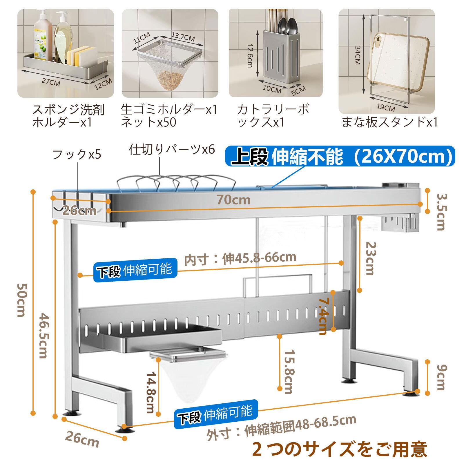 【伸縮デザイン】両側のサポートレグを引っ張ることで、水切りラックの伸縮ボードの長さを調整し、シンクの幅に完璧にフィットさせることができます。(※最上部の食器収納かごのサイズは固定で調節できません。)小さいサイズと大きいサイズがあって、シングルシンクもダブルシンクもほとんどのシンクが使用可能です。簡単にサイズ調整ができ、使い勝手が良いです。2つのサイズをご用意(幅伸縮範囲:小48-68cm/大68-87cm) 【回転式生ゴミホルダーが装備】付属のスポンジ洗剤ホルダーの底部には、回転可能な生ゴミホルダーが装備されています。50枚の水切りネットが付属しており、食器を洗う時に生ゴミホルダーを回転させてネットを取り付け、残飯や残菜を直接捨てることができます。使わない時は簡単にホルダーを回転させて収納できます。また、必要に応じて取り外すことも可能です。 【伸縮ボードに内蔵の包丁立て】ボードの背面に追加された一体型デザインで、ナイフを便利に収納できます。高さ1.2cmでナイフを包み込むことなく通気性が良いため、細菌の繁殖を防ぎ、衛生的で清潔です。