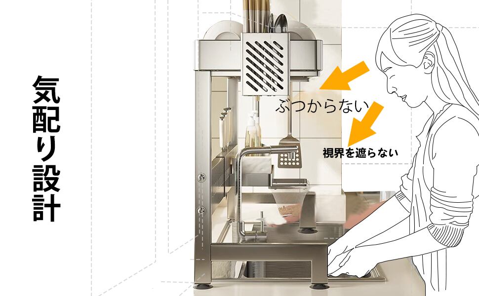 【伸縮デザイン】両側のサポートレグを引っ張ることで、水切りラックの伸縮ボードの長さを調整し、シンクの幅に完璧にフィットさせることができます。(※最上部の食器収納かごのサイズは固定で調節できません。)小さいサイズと大きいサイズがあって、シングルシンクもダブルシンクもほとんどのシンクが使用可能です。簡単にサイズ調整ができ、使い勝手が良いです。2つのサイズをご用意(幅伸縮範囲:小48-68cm/大68-87cm) 【回転式生ゴミホルダーが装備】付属のスポンジ洗剤ホルダーの底部には、回転可能な生ゴミホルダーが装備されています。50枚の水切りネットが付属しており、食器を洗う時に生ゴミホルダーを回転させてネットを取り付け、残飯や残菜を直接捨てることができます。使わない時は簡単にホルダーを回転させて収納できます。また、必要に応じて取り外すことも可能です。 【伸縮ボードに内蔵の包丁立て】ボードの背面に追加された一体型デザインで、ナイフを便利に収納できます。高さ1.2cmでナイフを包み込むことなく通気性が良いため、細菌の繁殖を防ぎ、衛生的で清潔です。