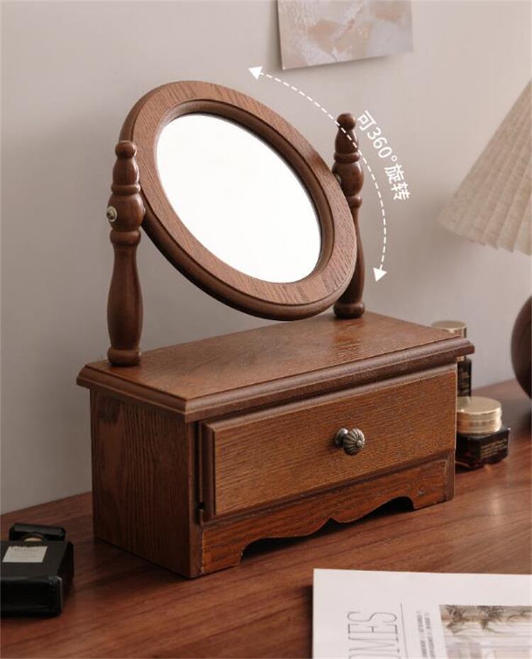 【引き出し無し】グルーミング鏡 木製鏡 回転可能鏡 シンプル 壁掛け鏡 木製化粧鏡 鏡卓上