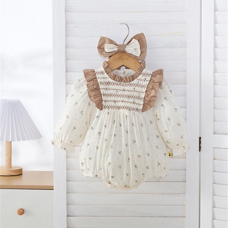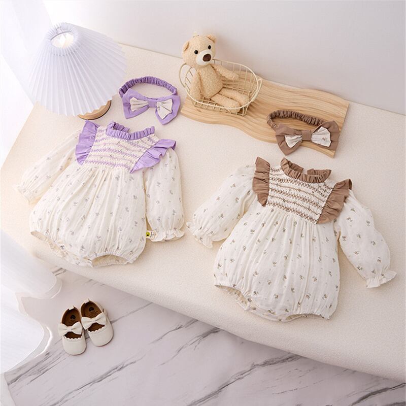 2025春新作 ベビー服 ヘアバンド付き 女の子 ロンパース 立ち襟 フラッタースリーブ 可愛い 子供服