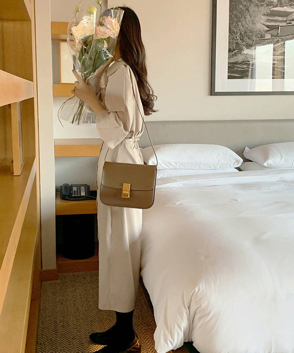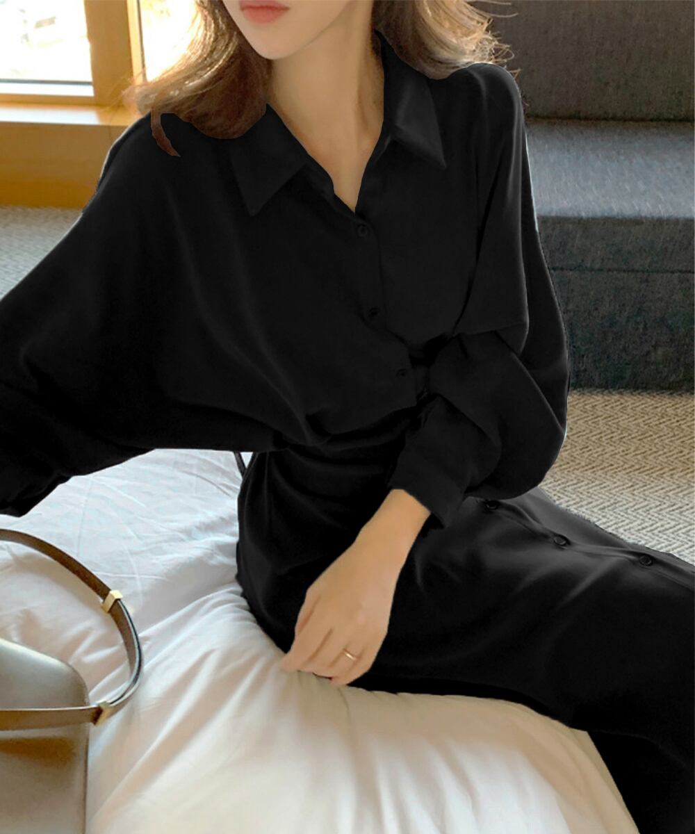 優雅なボリュームスリーブが特徴的な、韓国女優風のロング丈シャツワンピース